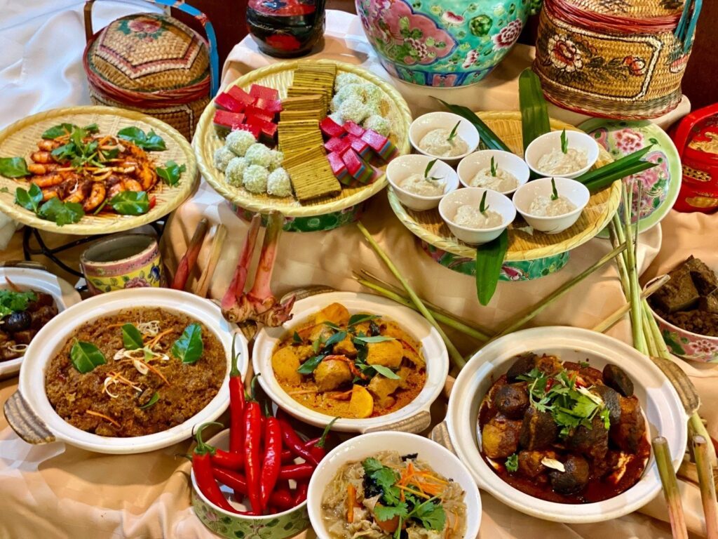 A: Ayam Buah Keluak, Sambal Udang, Nyonya Laksa Lemak, Durian Pengat, and Nyonya Kueh.