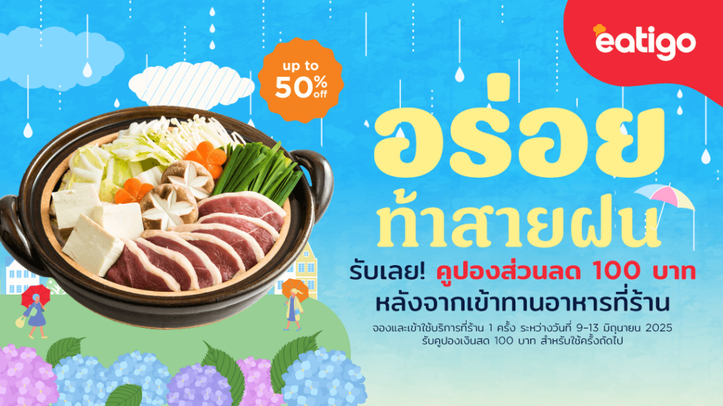 🌧️ อร่อยท้าสายฝน กับ eatigo – รับคูปองเงินสด 100 บาท!